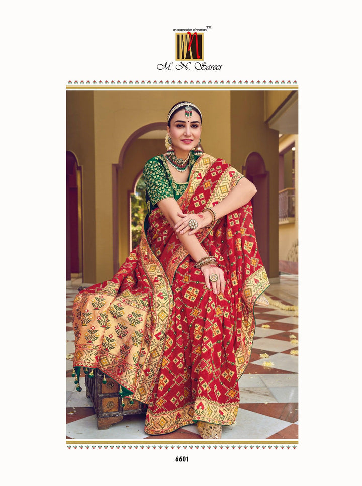 Exclusive Bridal Wear Designer Traditional Sari. Red/Maroon Mirror Khatli & Cut Dana Resham Zari Thread Embroidery, Patola Patterned Weaving Bordered Georgette Viscose Saree of 5.50 mts. with Tassels. Green Unstitched Silk Blouse of 0.80 mts. with Work. Dry Clean only.