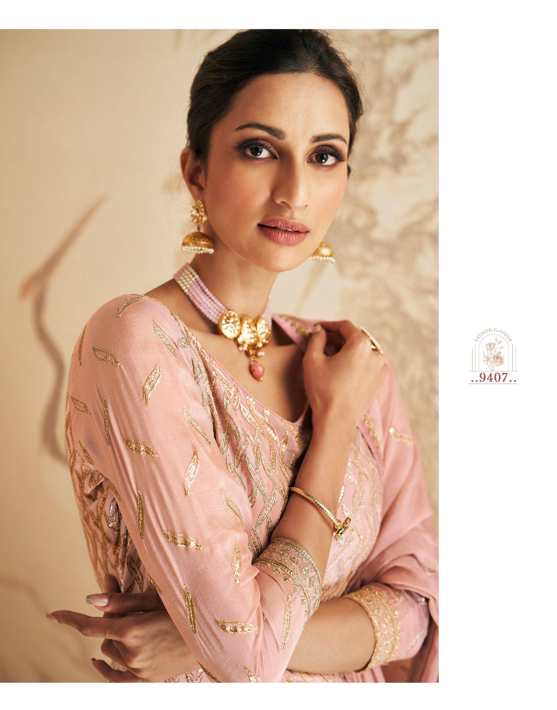 Exclusive Latest Designer Wear Stitched Kurta Set. Lavender Pink Chinon Silk Stones, Sequins, Resham Zari Thread Embroidered Short Kameez upto 42" Bust, Lavender Pink Chinon Silk Stitched Sharara Style Palazzo Bordered...