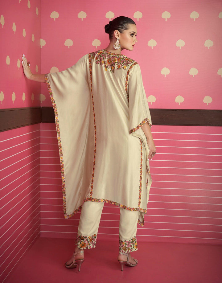 Exclusive Engagement Party Wear Indo Western Designer Readymade Stitched Kaftan Style Top. Off-White Silk Stones Sequins Zari Resham Thread Embroidered Patterned Asymmetrical Kurta upto 42". Off-White Silk Pant Style Bottom with...