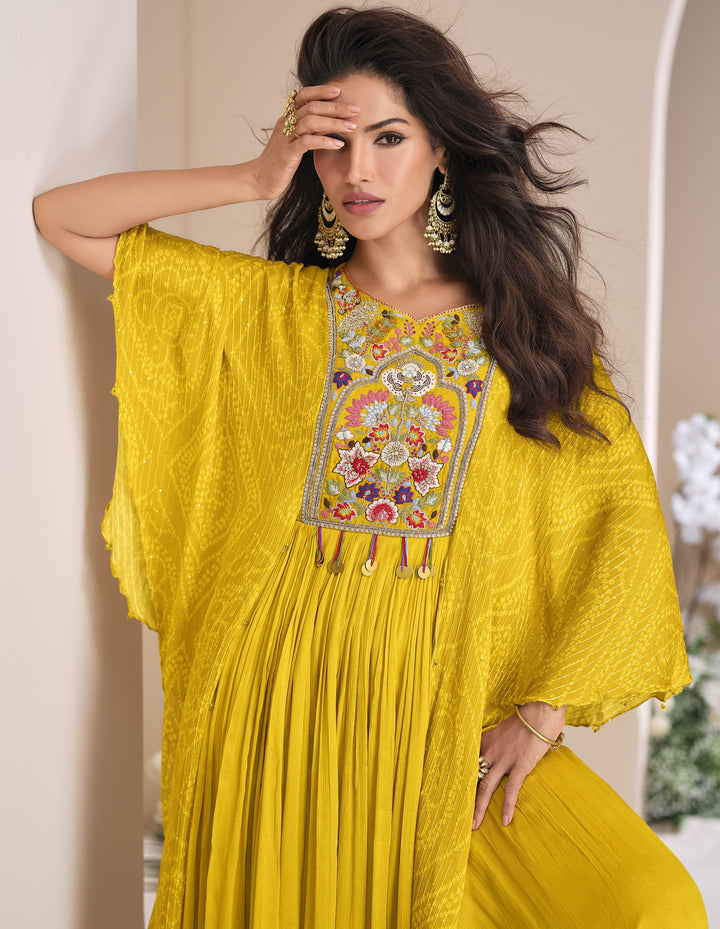 Festive celebration wear indo western party gown. Yellow silk stitched long haldi dress. Engagement, sangeet special stylish attire. Fusion fashionable outfit. Sequins, stones, thread zari resham embroidered plain floor length gown with lining, embroidered and embellished yoke, bandhej digital printed shrug style patterned sleeves available in sizes M, L, XL, XXL.