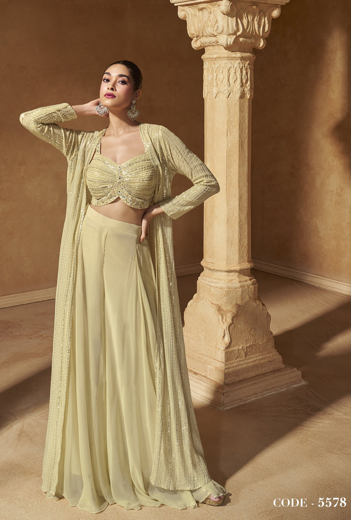Bridal partywear. Light khaki georgette palazzo with crop top and long jacket. Exclusive indo western free size dress. Reception special stitched fusion fashion 3 piece set. Sequins, stones, moti, resham thread...