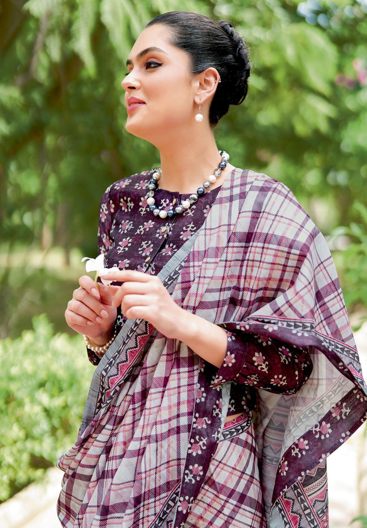 Purple Checks Pattern Silk Sari | Double Blouse | For Everyday Fashion