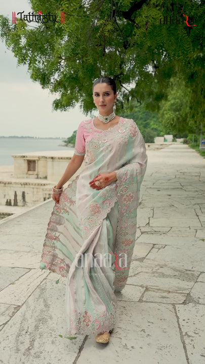 Destination wedding wear shaded pastel jacquard viscose silk weaving saree. Shaadi ceremony attire. Exclusive engagement and sangeet outfit. Sequins, stones, moti, applique patch work, self booties weaving all over, zari resham cut dana hand embroideed saree of 5.50 mts. with tassels. Pink silk unstitched contrast blouse of 1.2 mts. with full work.