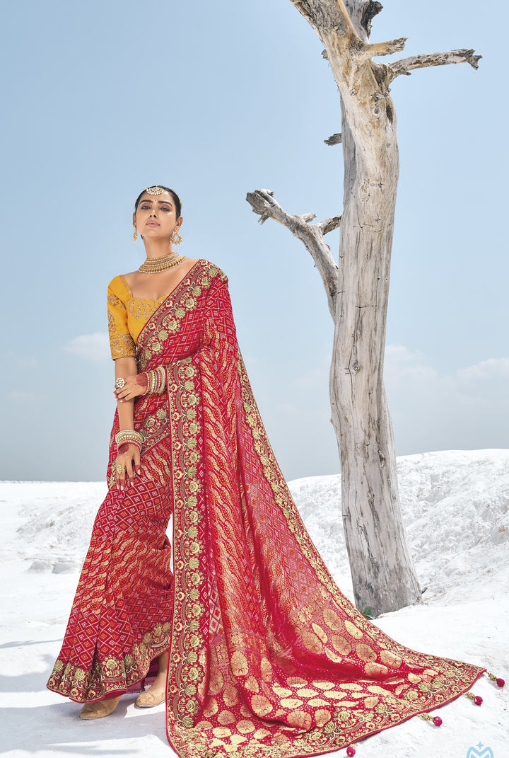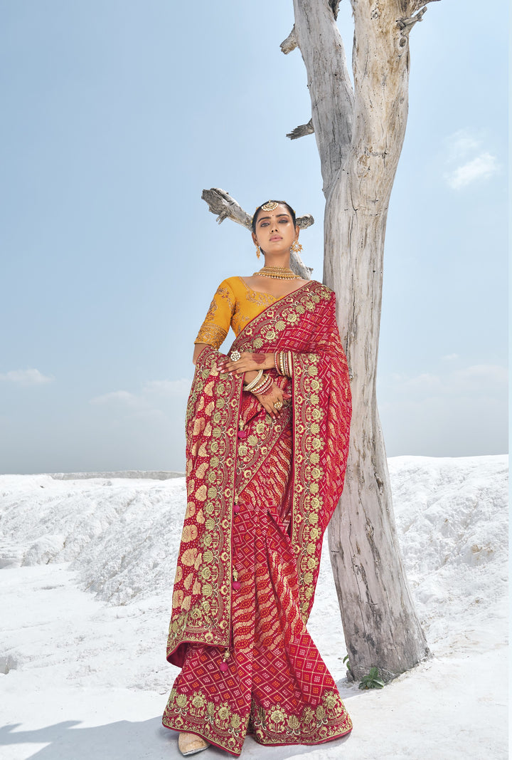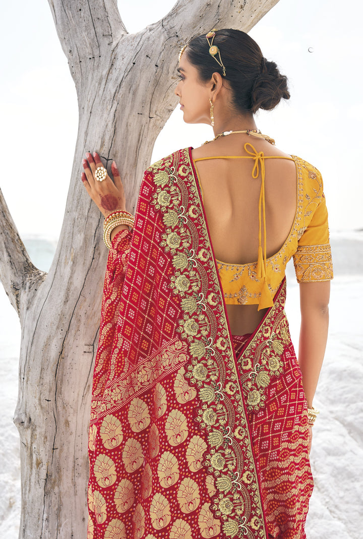 Destination wedding pink bandhej patola georgette silk sari. Traditional shaadi attire. Rajasthanii art exclusive ethnic marriage outfit. Sequins, stones, zari weaving, resham thread embroidered and bordered saree of 5.50 mts. with tassels. Yellow silk unstitched blouse with work of 0.80 mts. comes alongwith a plain blouse also.
