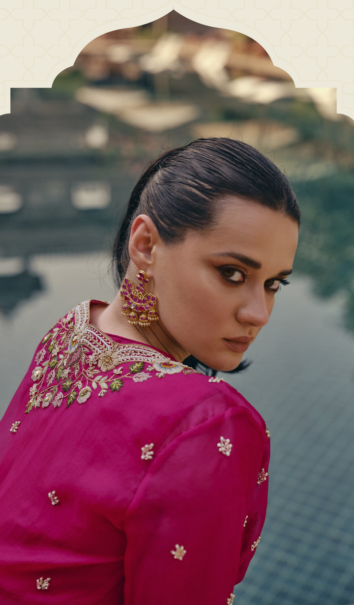 - Fabric: Top: Silk Georgette Bottom: Georgette Silk Shrug: Silk Georgette